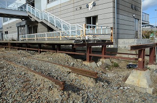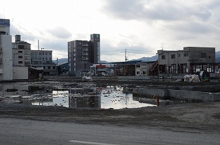 魚市場のあたりは、港の中にがれきがあり、家がなくなったところには水がたまっている。鹿折駅の前には、大型サンマ船がまだある。